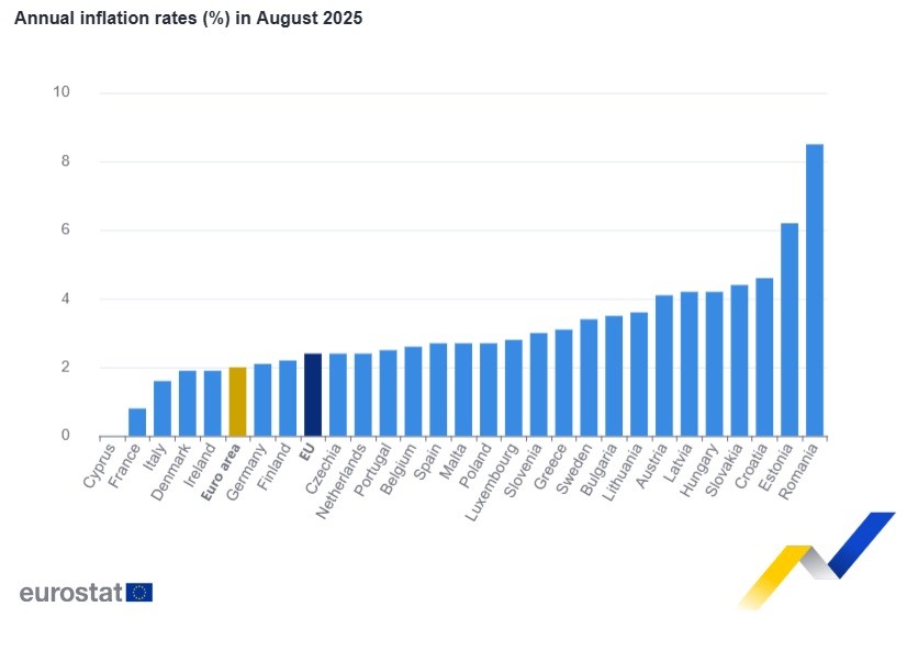 Roční míra inflace v eurozóně činila v srpnu 2025 2,0 %, což je stejná hodnota jako v červenci. O rok dříve činila míra inflace 2,2 %.